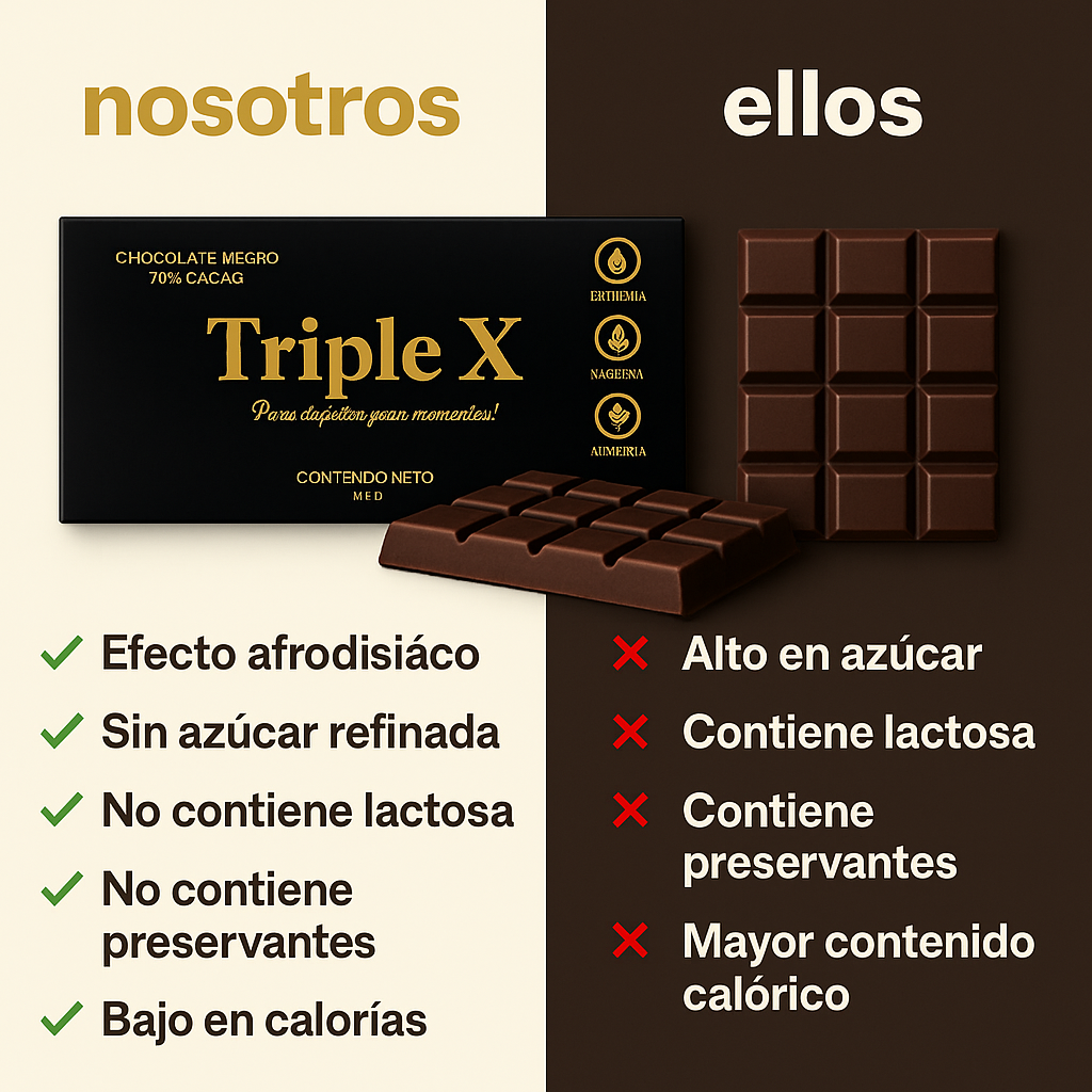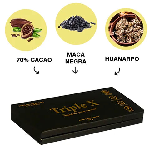 Contiene 70% de cacao, maca negra y huanarpo (el viagra natural) para mejorar el rendimiento y el deseo sexual en hombres y mujeres.